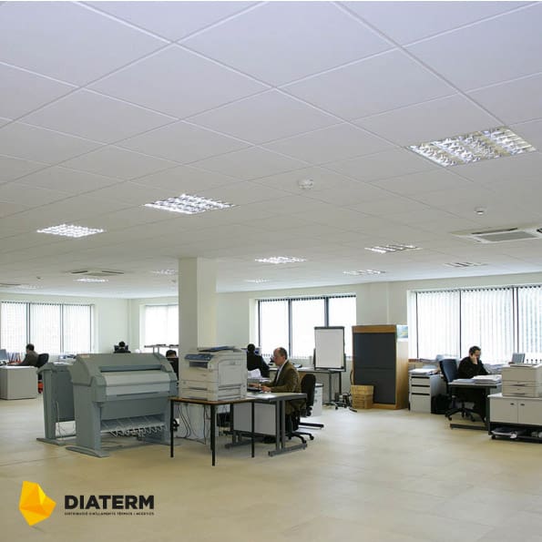 El sostre Thermatex Acoustic ens ofereix un nivell elevat de reflexió a la llum i una absorció acústica mitjana. És ideal per a comerços, oficines i sales de reunions, cambres d’instal·lacions o àrees de producció.