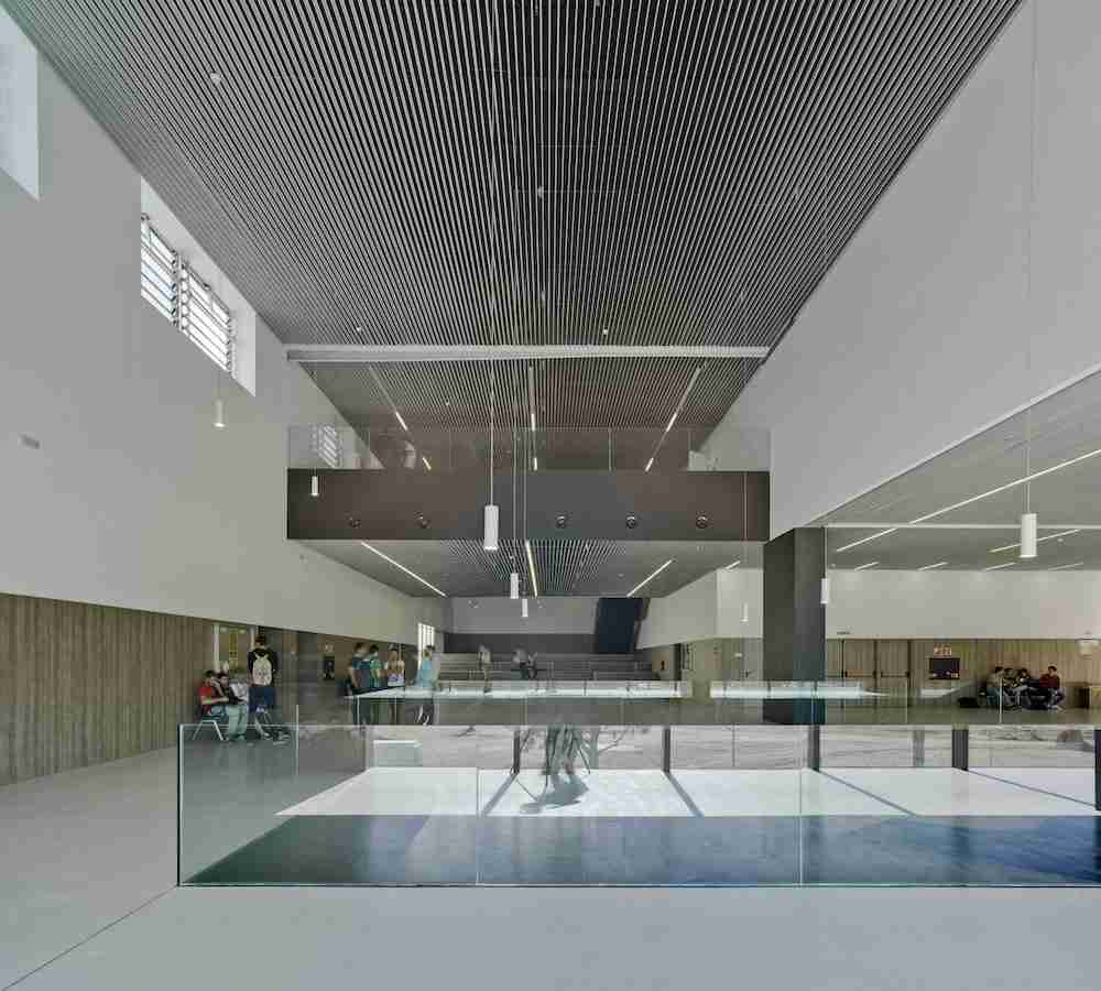 Acabat blanc mat setinat amb fissures i microperforacions que augmenten l'absorció acústica del sostre.