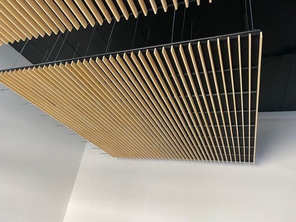 L’absorció acústica d’aquest sistema s’aconsegueix mitjançant la instal·lació després dels llistons de panells de llana de roca amb vel negre de 22mm Rockfon Color-All. Proporcionar un coeficient d’absorció acústica de αw 1,00. (Classe A)