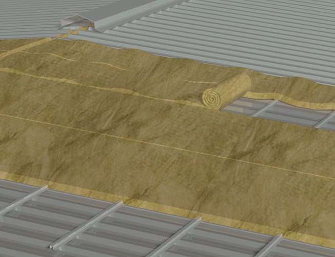 Manta de lana de vidrio recubierta con un velo reforzado. Aplicación: Sistemas de fachada industrial fabricados in situ, con doble chapa metálica.