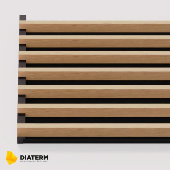 Sistema modular acústico de lamas de madera natural integradas a rastreles troquelados que facilitan la colocación en falsos techos y/o paredes. Disponible en acabado natural o diversos tonos tintados según catálogo. La mecanización específica de los rastreles, permite incorporar