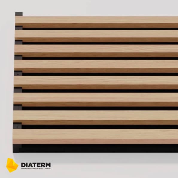 Sistema modular acústico de lamas de madera natural integradas a rastreles troquelados que facilitan la colocación en falsos techos y/o paredes. Disponible en acabado natural o diversos tonos tintados según catálogo. La mecanización específica de los rastreles, permite incorporar
