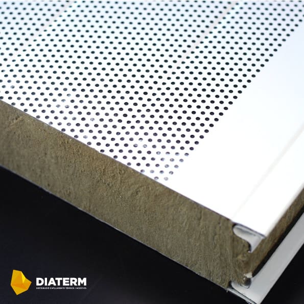 Panel Sándwich de lana de roca de baja densidad con cara inferior perforada para permitir la absorción acústica en acondicionamiento de espacios.