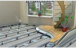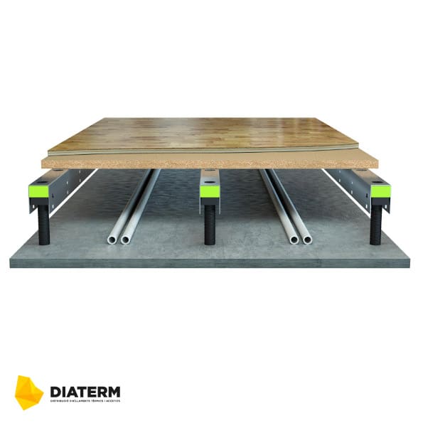 Sistema de suelo técnico elevado continuo, que incorpora tacos Sylomer de poliuretano microcelular para reducir propagaciones a sonidos de impacto. Válido para nivelaciones desde 30 y hasta 420mm de altura.
